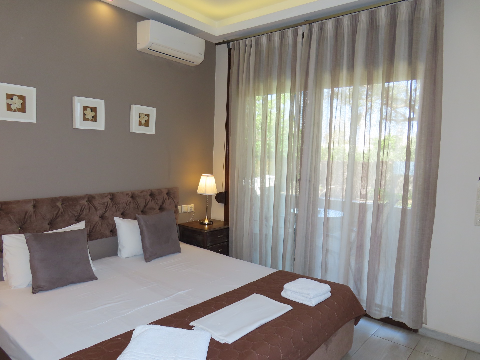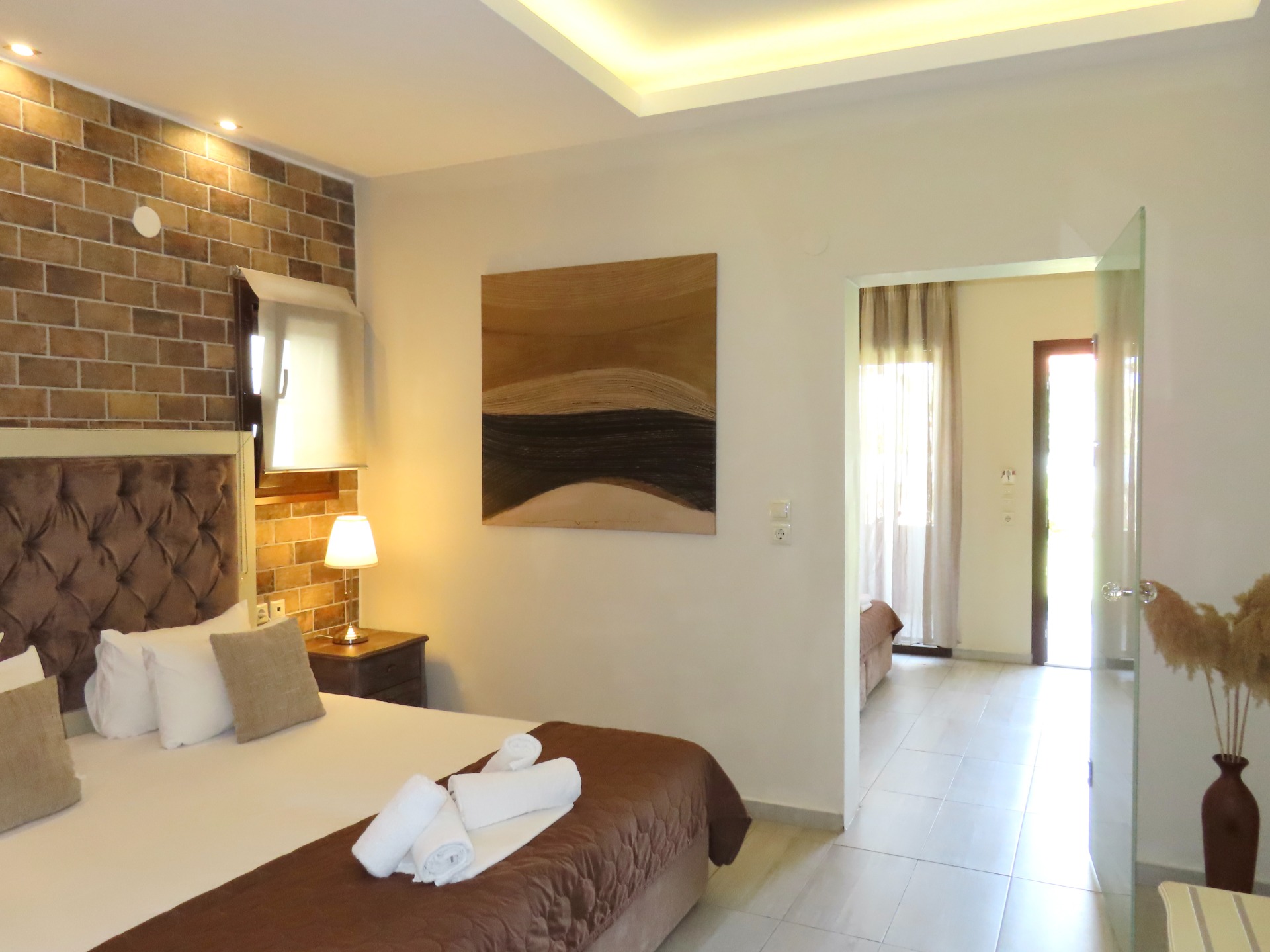 Aroma Villa Studios offers a range of studios and apartments, all decorated in soothing shades of beige and brown with stone accents that harmonize beautifully with the surrounding greenery.