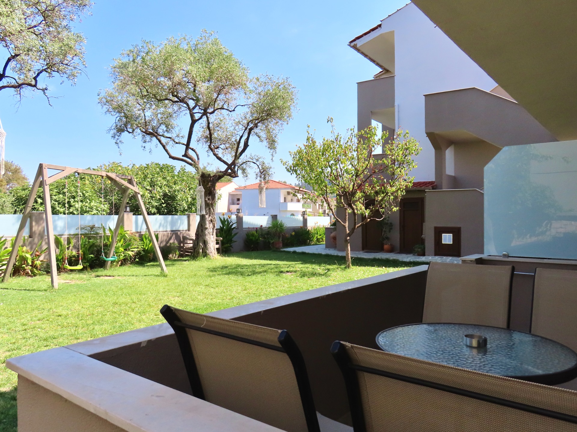 The property consists of two charming buildings with studios and apartments. It features a large swimming pool with a spacious surrounding area, equipped with comfortable sun loungers, umbrellas, and seating. The pool bar serves coffee, soft drinks, and alcoholic beverages, making it the perfect spot to relax. At the back, a lush garden with two playground swings provides fun and carefree moments for young guests.