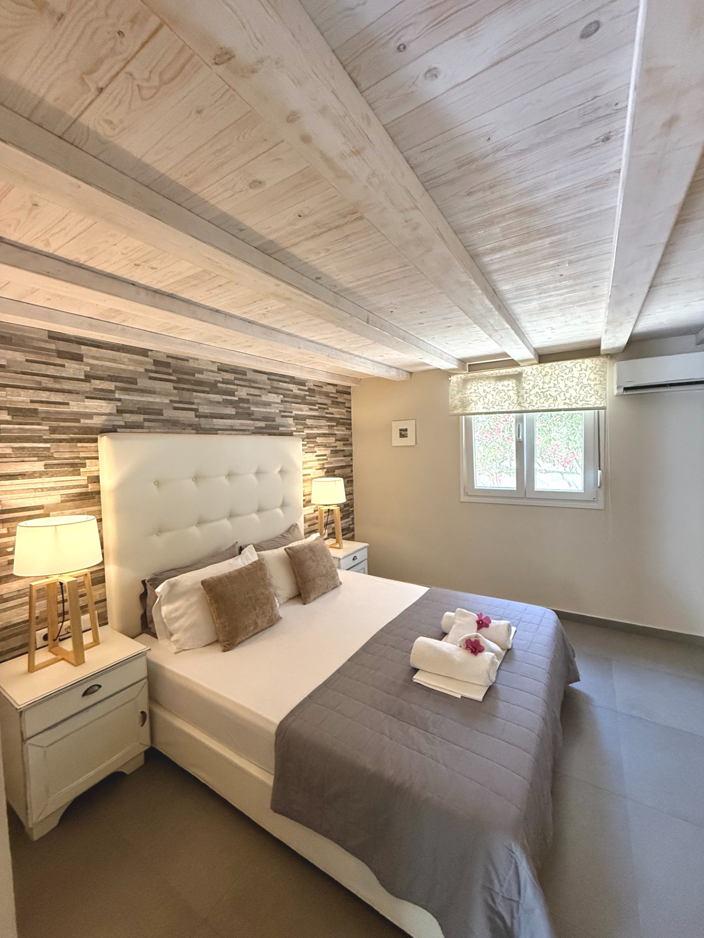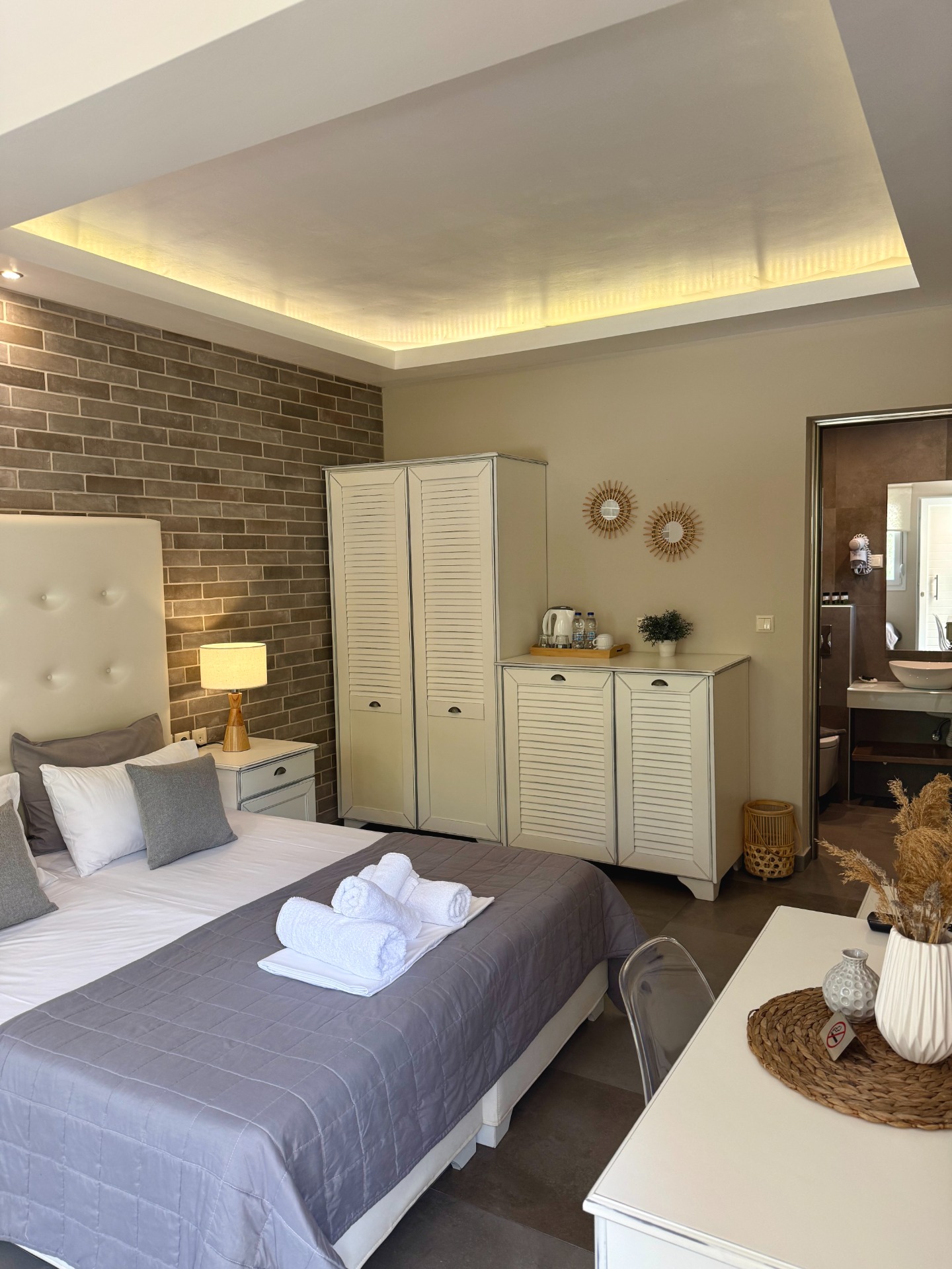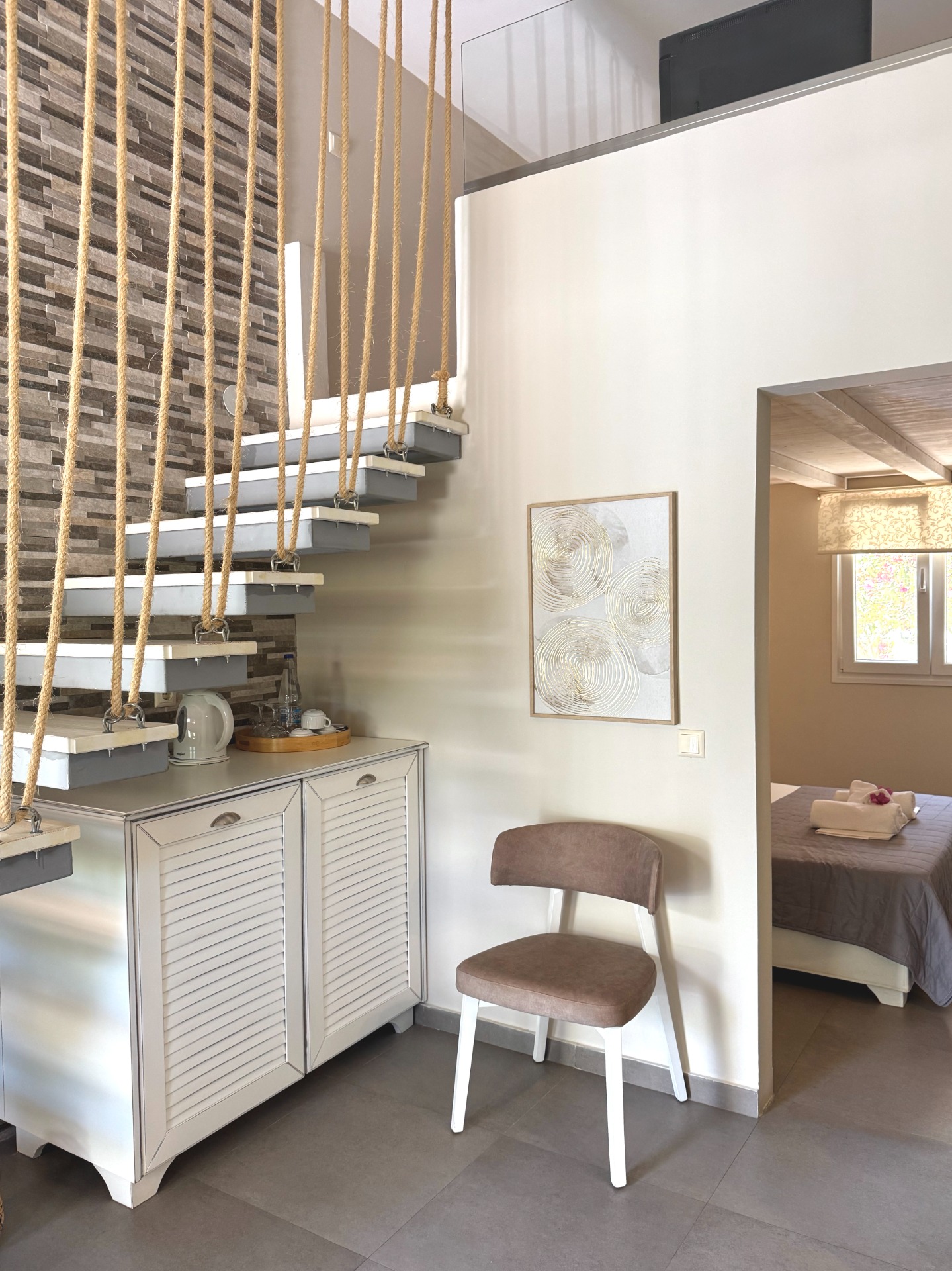 Each space is thoughtfully decorated in calming shades of white, grey, and beige, with stone details that blend seamlessly with the natural surroundings.