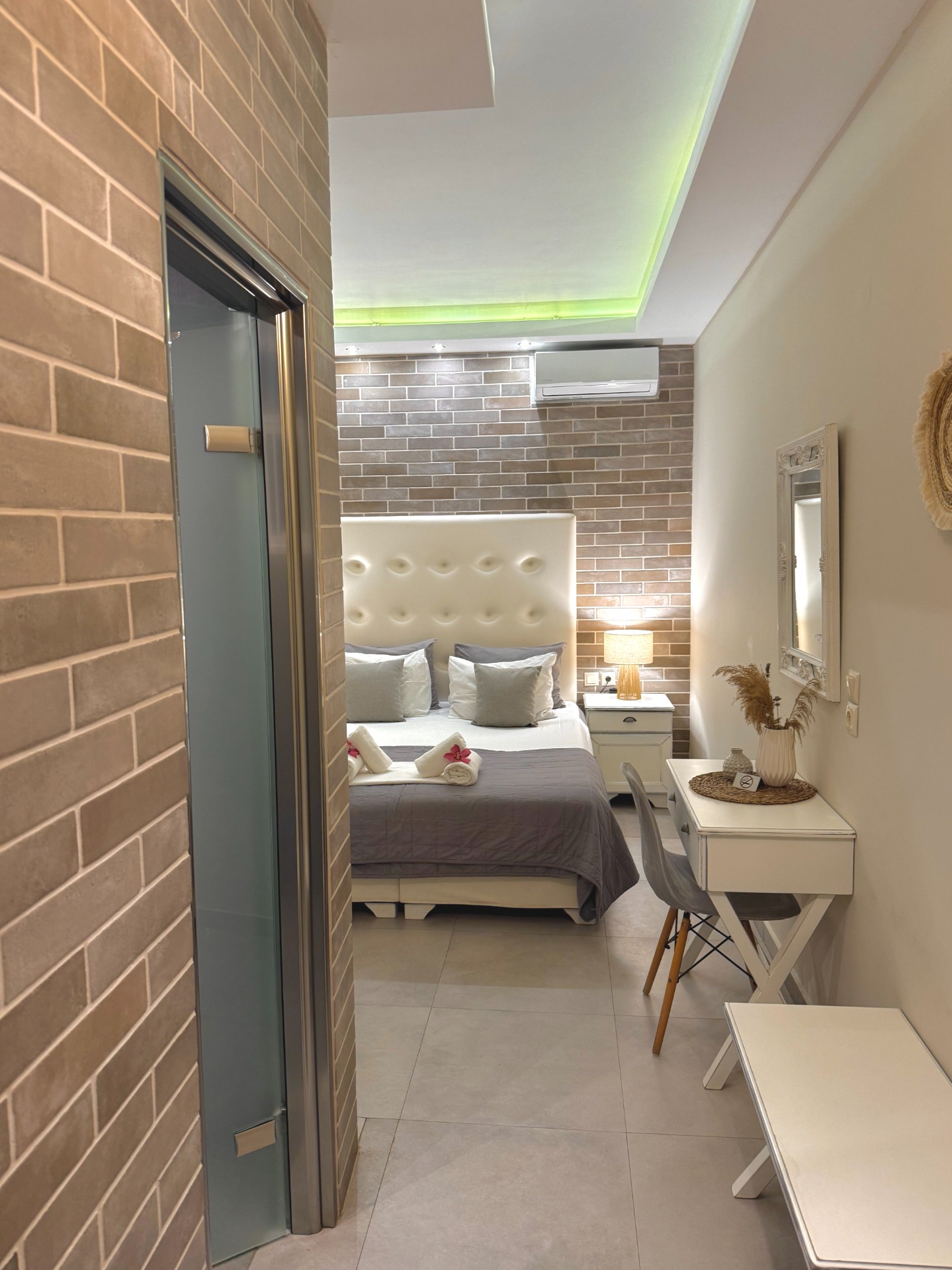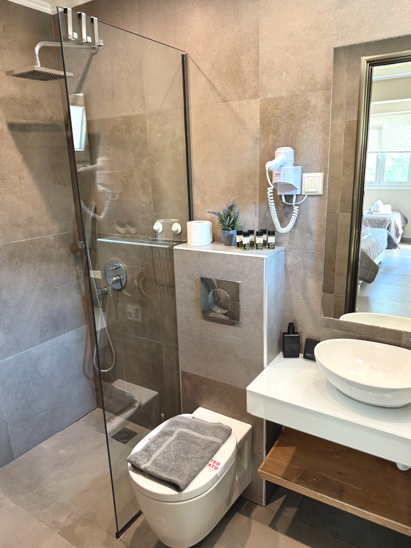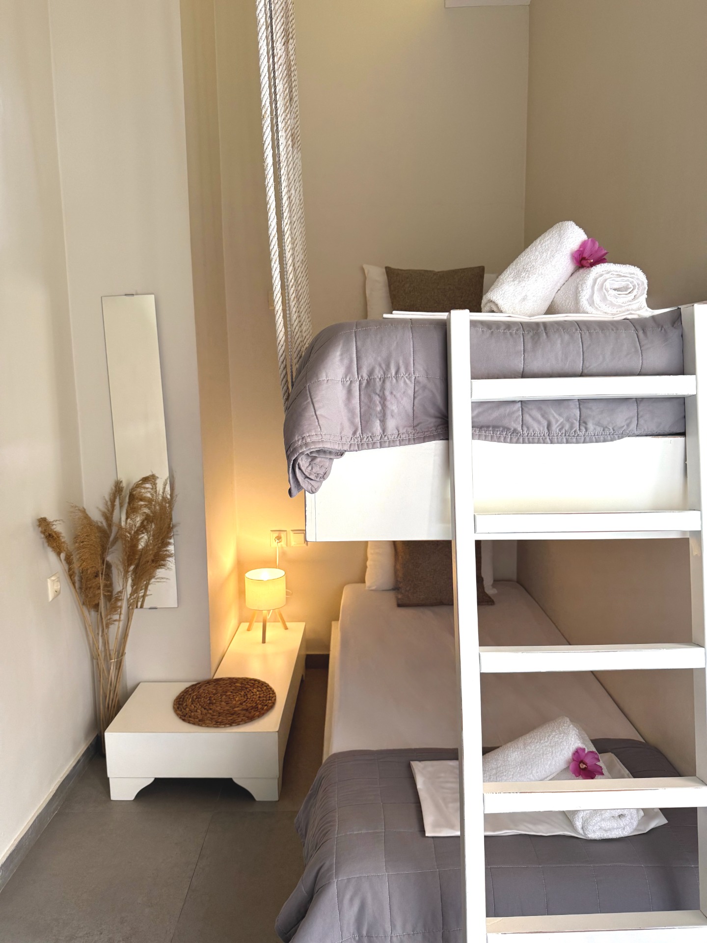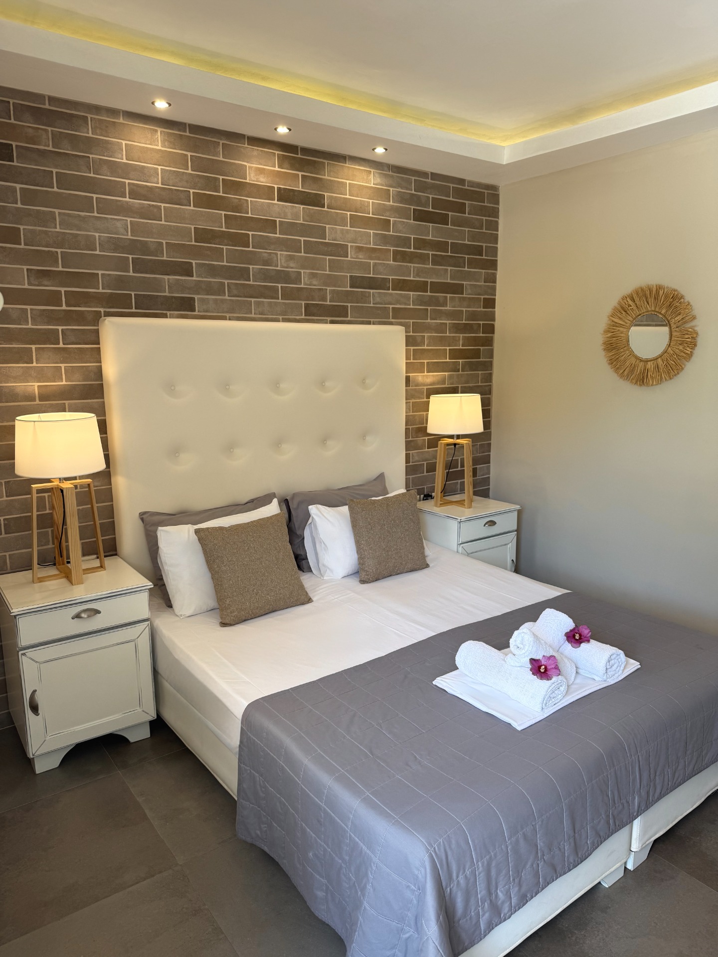 Each space is thoughtfully decorated in calming shades of white, grey, and beige, with stone details that blend seamlessly with the natural surroundings.