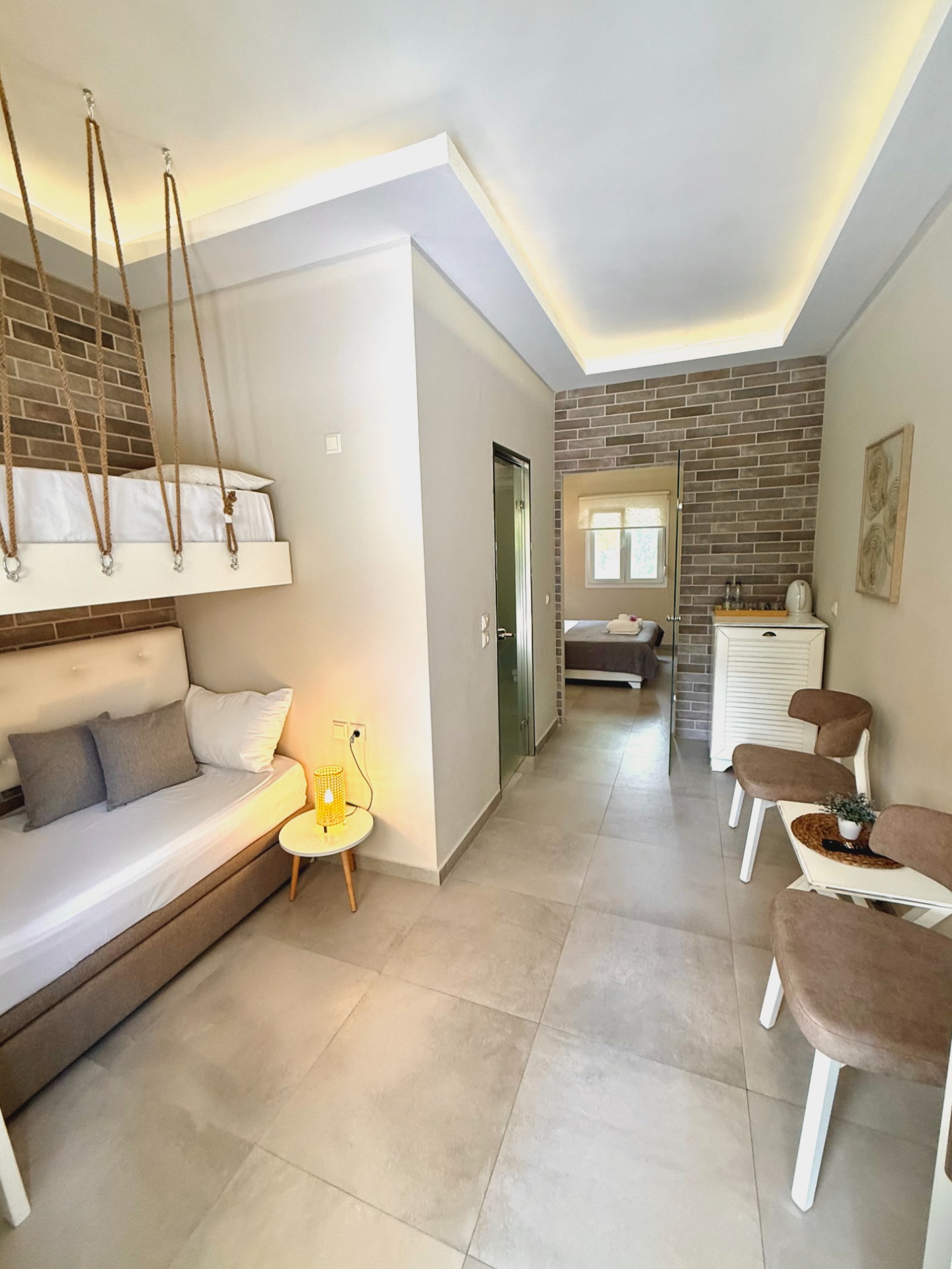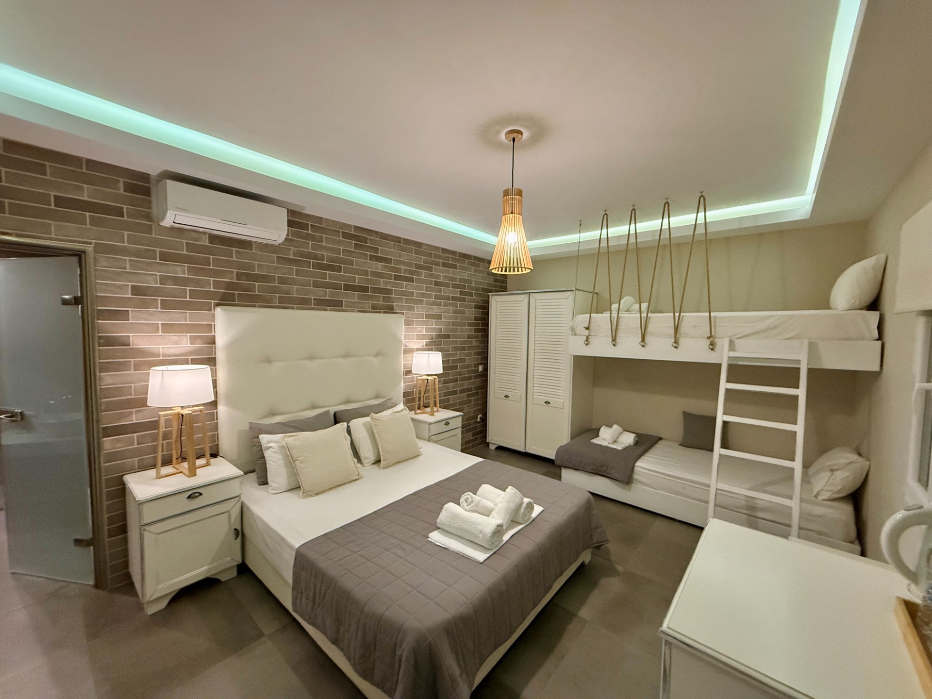 It features a bedroom with a comfortable double bed and an adjoining outer space with two bunk beds, separated by a glass door for added privacy.