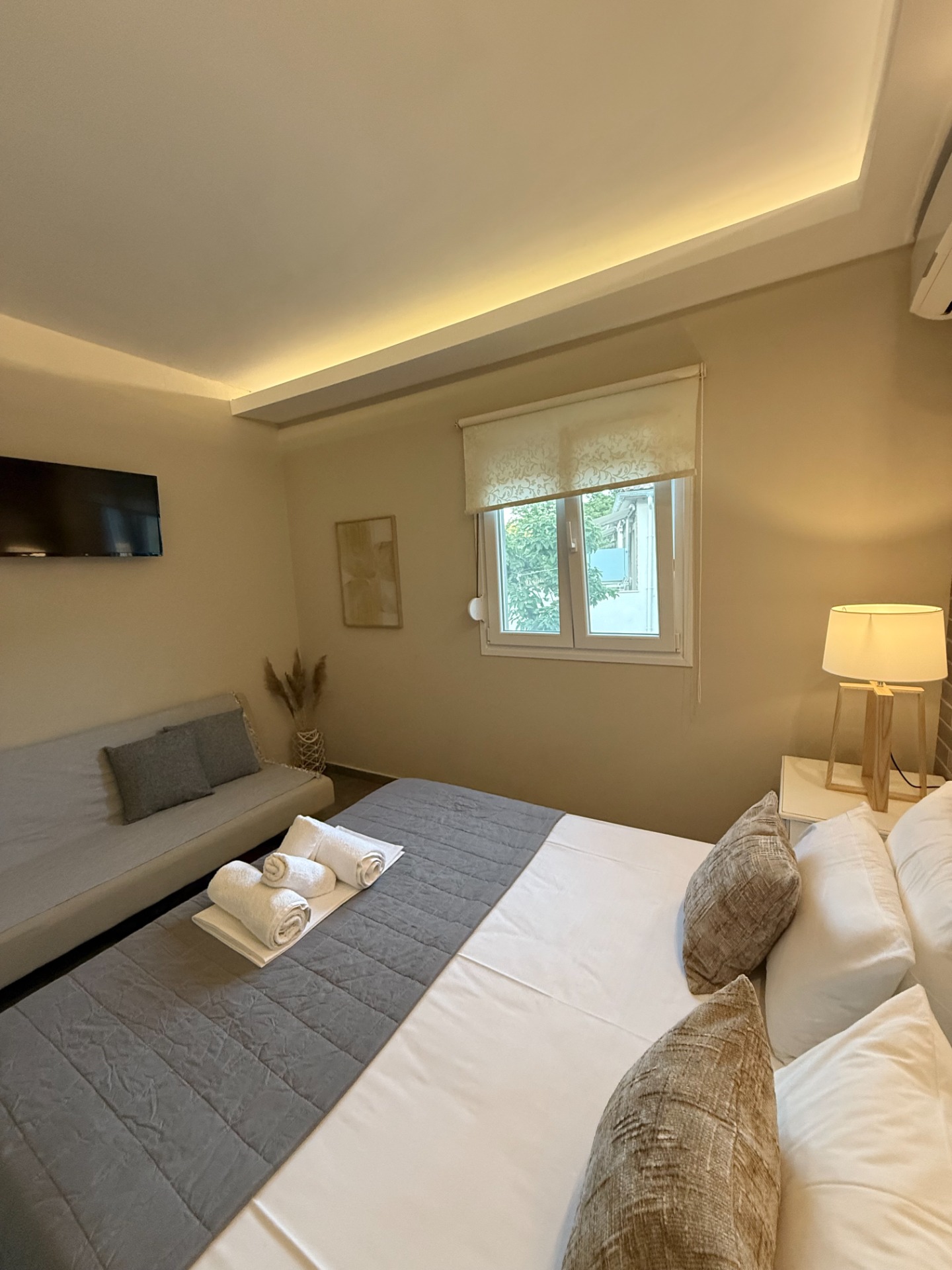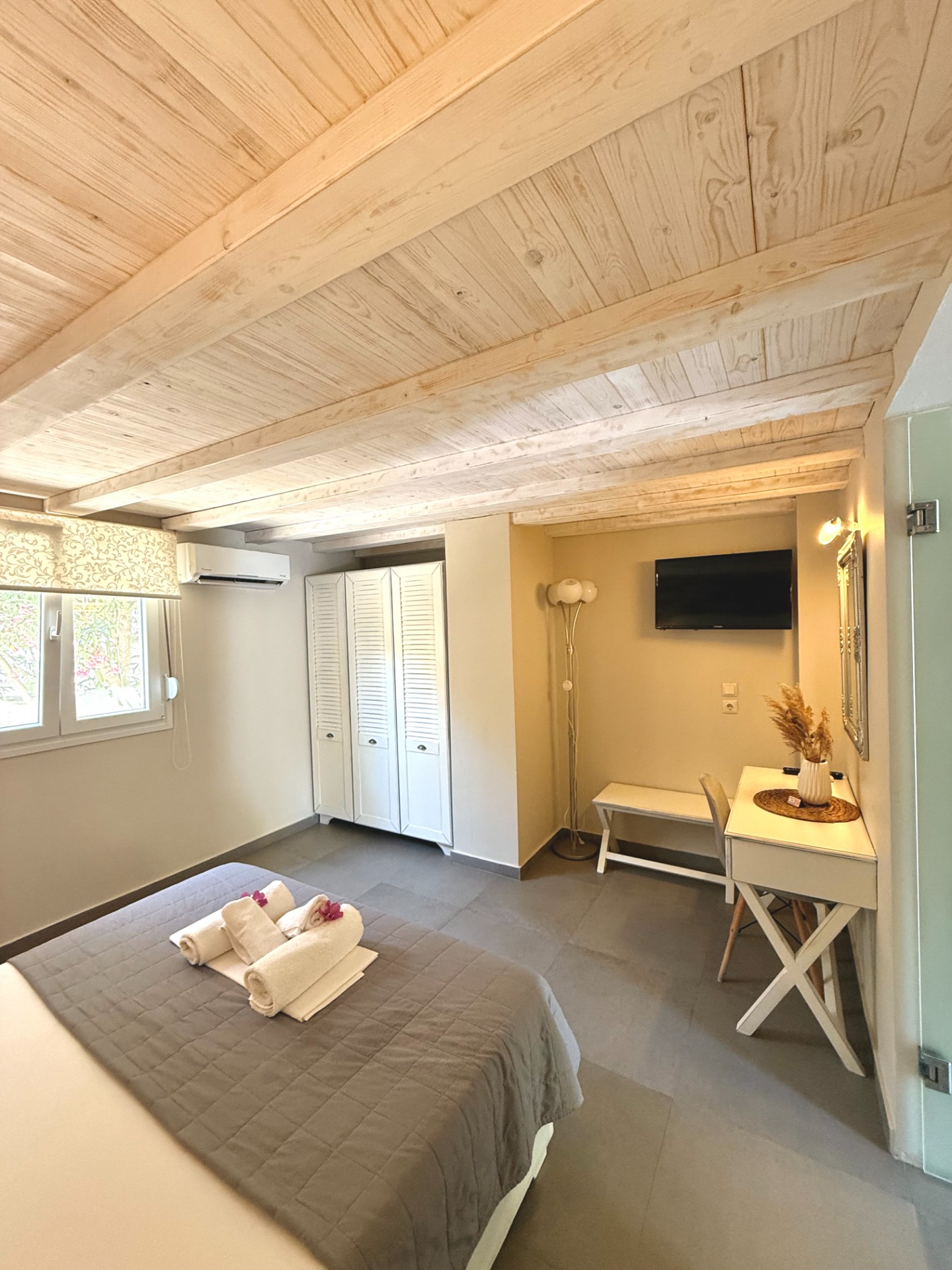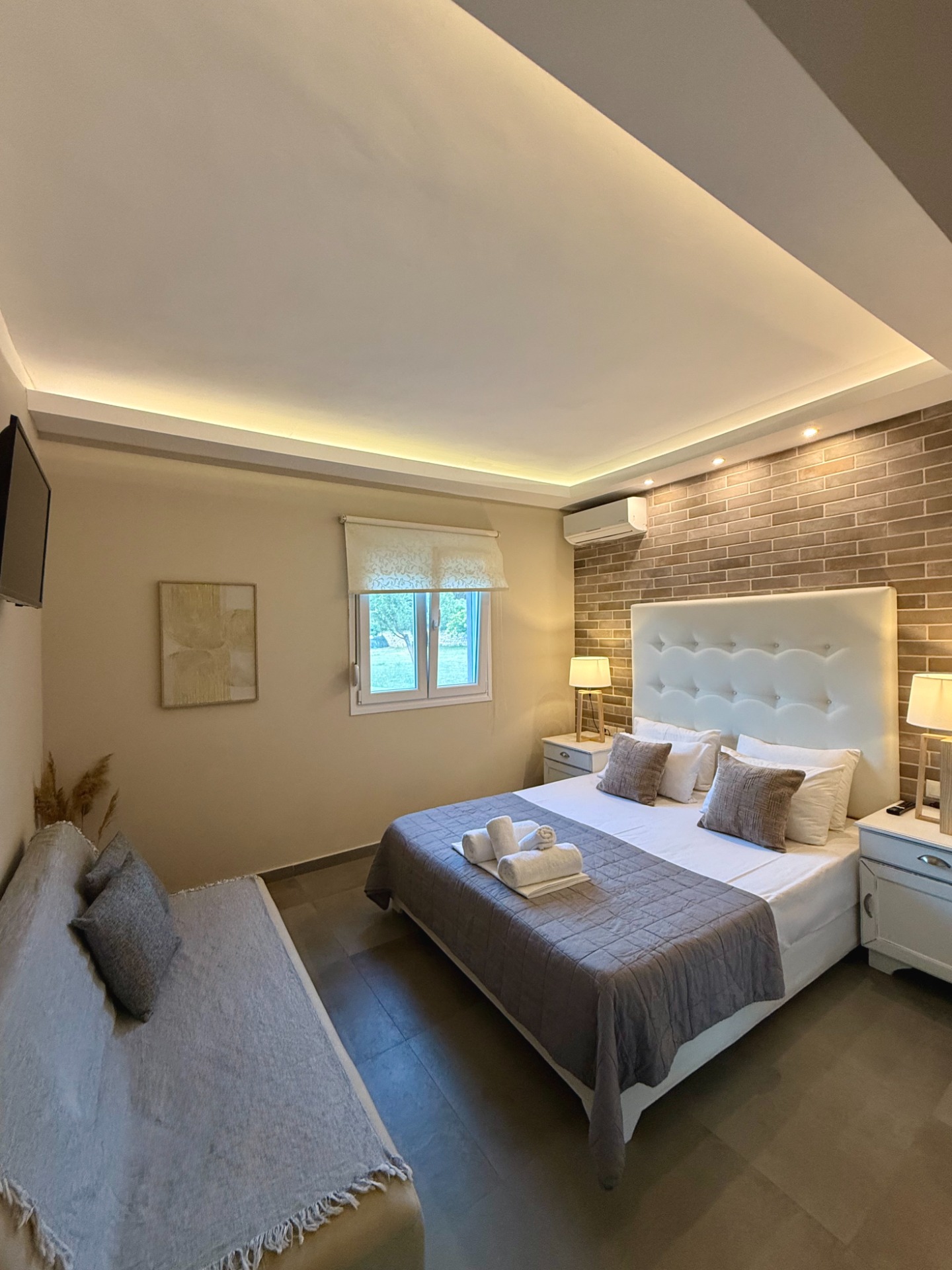 Our double rooms are scattered throughout the property, offering views of the hotel's lush olive tree garden.
